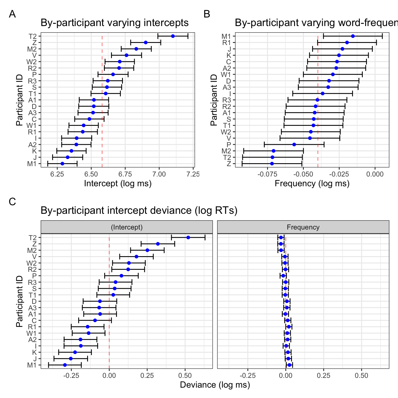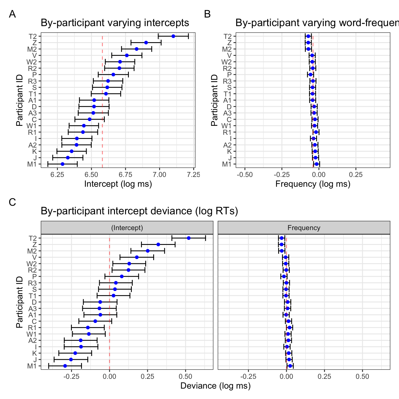 Looking back at Figure 4 B, the confidence intervals are also much wider than in the frequency plot in Figure 4 C. This is simply because of the x-axis range: in the latter, the x-axis range is identical to that of the varying intercepts, which has a broader range. That is to say, there was more within-participant variance in overall reaction times than there was in the overall effect of frequency. Figure 4 B simply has the range of values relevant for the slope values.
