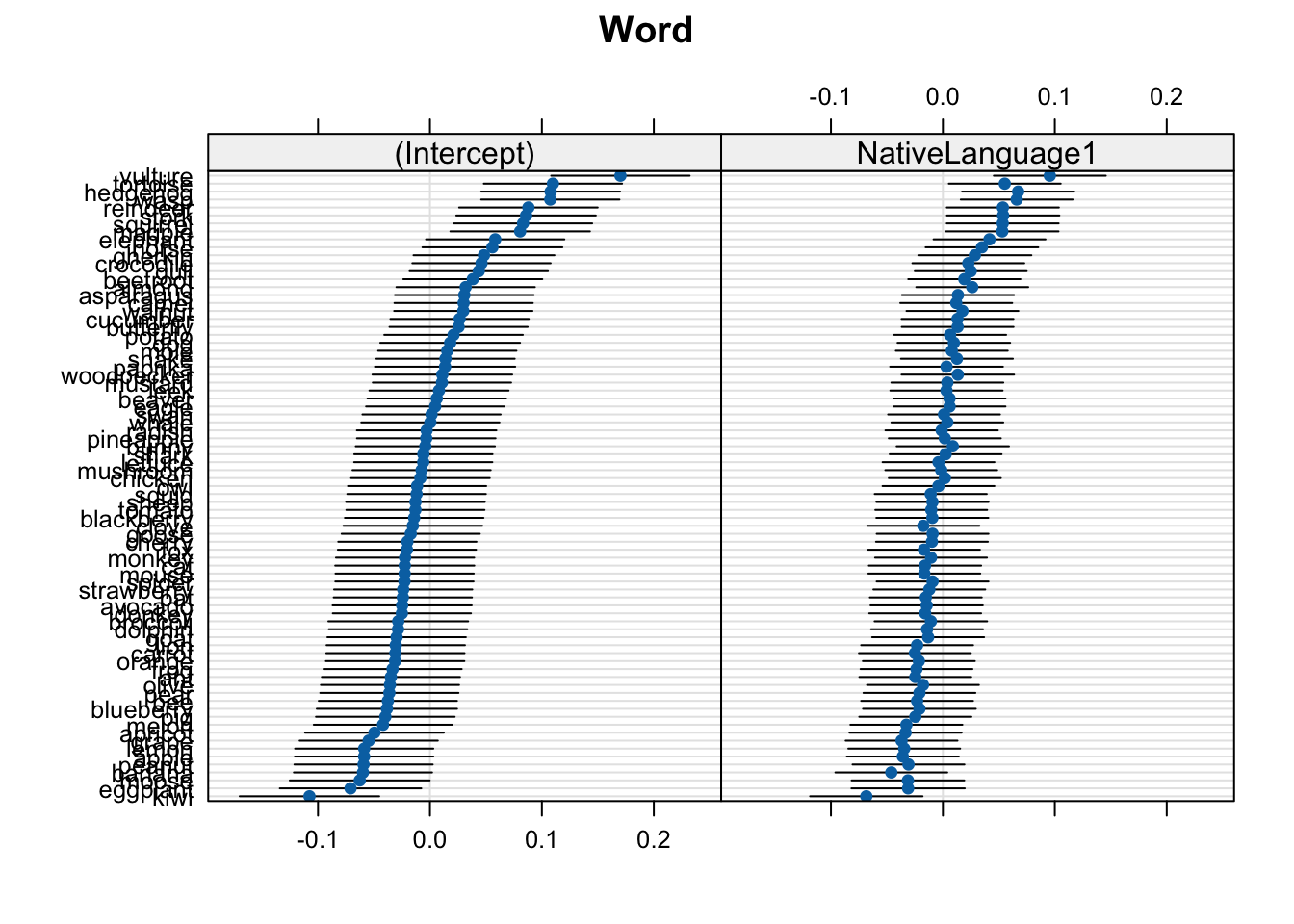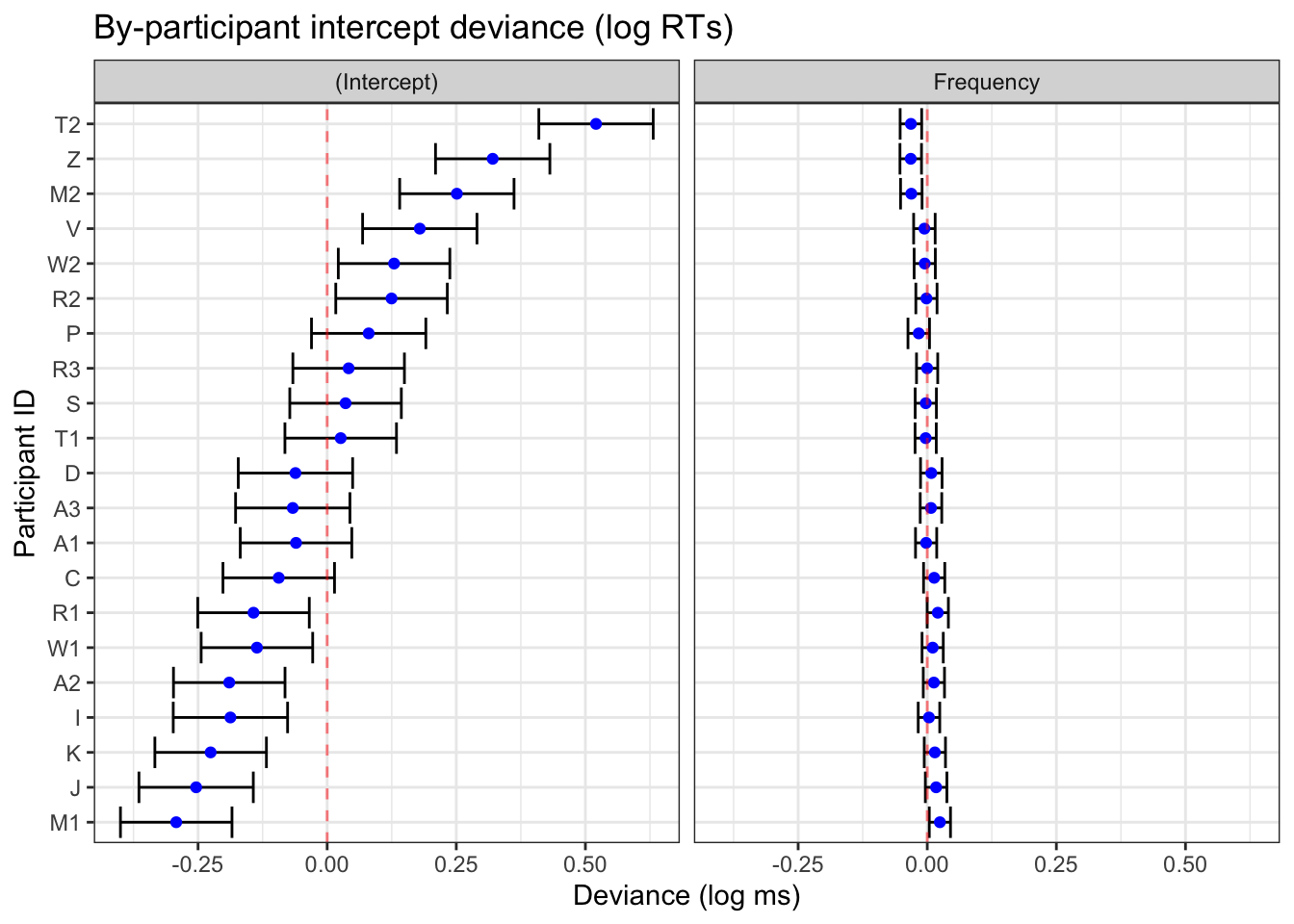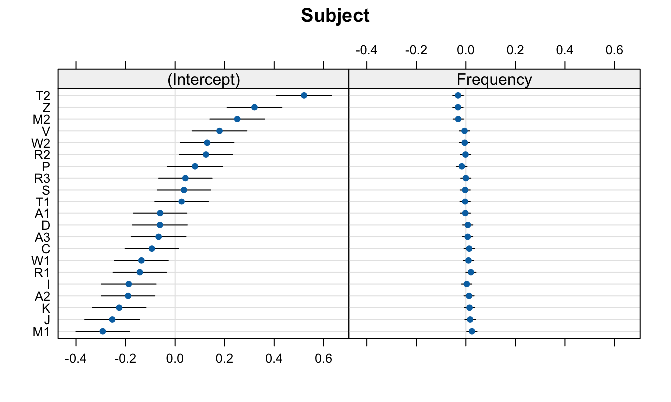 In Figure 5 we see that the varying slope values are ordered by by-participant intercept value (maintaining the correlation visulation), and that the x-axis ranges are comparable. The only difference is htat in Figure 5 B, the population-level slope value (-0.0398787) is centred, whereas in the frequency facet in Figure 5 C, 0 is not quite centred. Let’s compare this one last time to the deviance dotplot we get with lattice::dotplot(ranef()) (Figure 6).
