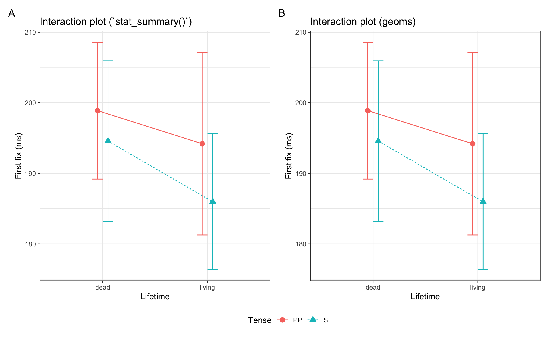 theme(legend.position = "bottom")ggplot() and using stat_summary() (A) or feeding a summary table into ggplot() and using geoms (B)